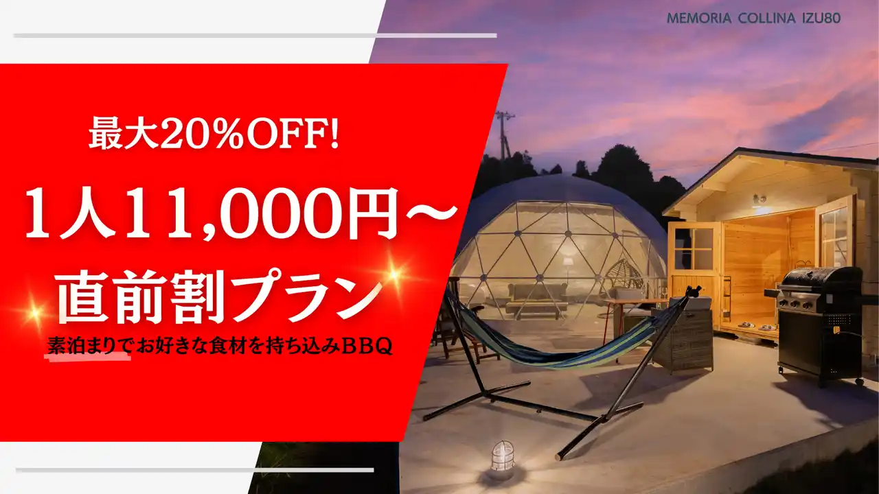 静岡県・伊豆エリアに位置する 「Memoria Collina IZU80-メモリアコリーナ伊豆80」 が、最大20%OFFの1人1泊11,000円~で宿泊できる「直前割プラン」と、小学生以下が無料になるファミリープランの販売を開始しました。 急なご旅行や週末のお出かけにも最適で、ご家族や愛犬との特別なひとときをこれまで以上に気軽にお楽しみいただけます。 |