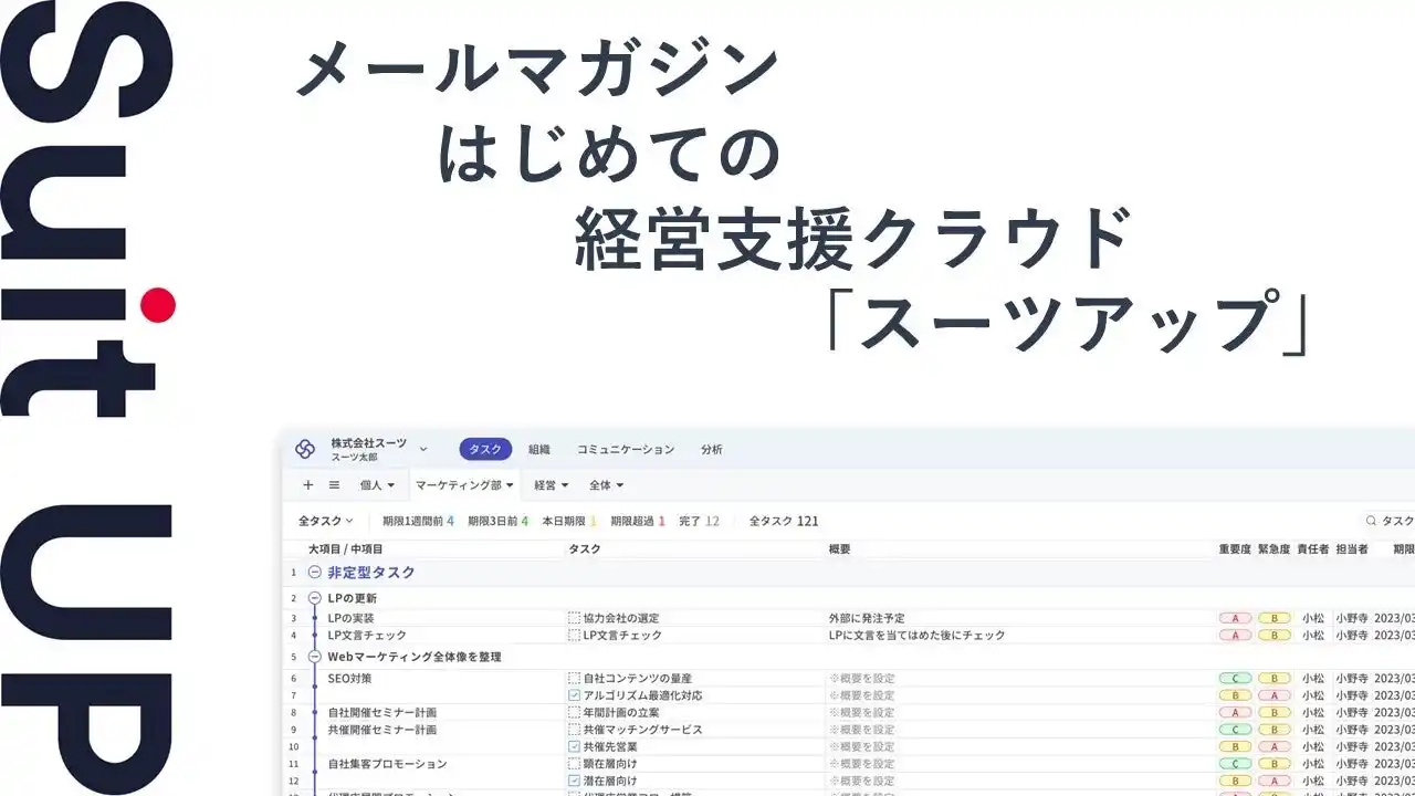 | 当社では、メールマガジン「はじめての経営支援クラウド『スーツアップ』」を作成しました。スーツアップの開発・運営会社の株式会社スーツの社長・小松裕介とインターン武田さんによる全10回の対談を通じて、今、なぜ「チームのタスク管理」が求められているか?を分かりやすくお伝えします。 | ||||||||