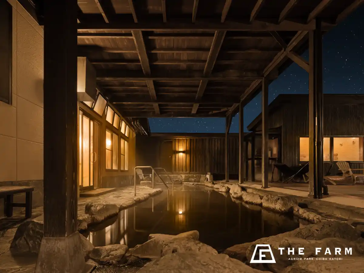 農園リゾートTHE FARM内に併設された、おふろcafe かりんの湯。 千葉県香取市にあるこの場所は、都心から約90分の近さにもかかわらず、喧騒を離れて自然の静けさに身をゆだねられる環境にあります。 |