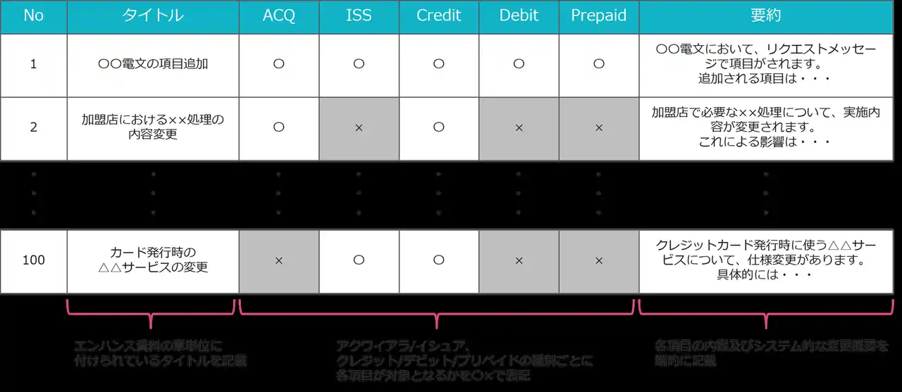 年に数回実施されるブランドエンハンス対応では、国際ブランドごとに約1,000ページに及ぶ英語の資料が配布されることもあります。カード発行会社や加盟店契約会社はそれらの資料を翻訳し、機能追加やセキュリティ強化といった項目ごとにチェックリストを整理したうえで、対応を進める方法が一般的です。 |