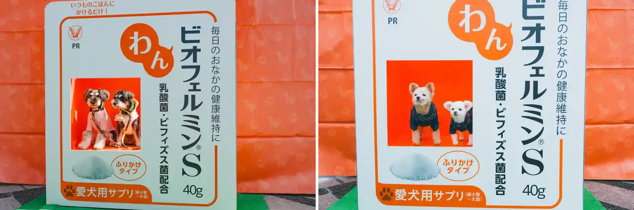 大正製薬株式会社の「わんビオフェルミンS」フォトスポットでは、愛犬が“パッケージになりきり”撮影できるユニークなブースが登場し、会場でもひときわ賑わいを見せていました。来場者の皆さまは愛犬をパッケージ内に収め、思わず笑顔がこぼれるような写真撮影を楽しまれていました。 |