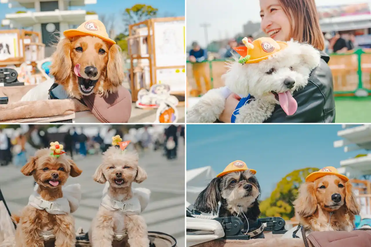 今回のイベントでは、わんちゃん用の帽子「わんわん幼稚園帽」や、愛犬の写真をはめて持ち歩ける「フラッフィーくんなりきりアクキー」、定番の「わんこぴん」、新作のステッカーやクリアファイルなど、多彩なオリジナルグッズを展開しました。これまで以上に充実したラインアップとなり、多くの来場者にお楽しみいただきました。 これらのグッズを身につけて会場を楽しむわんちゃんたちの姿も多く見られ、イベント全体の盛り上がりを一層高めました。 |