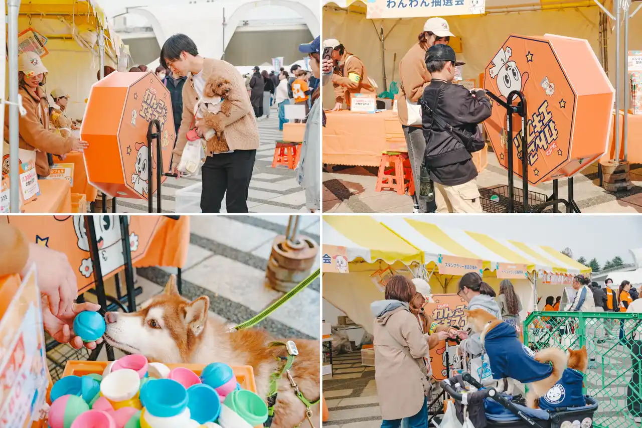 イベントの大人気企画「わんわん抽選会」では、大人の背丈ほどの高さを誇る巨大抽選機が会場の注目を集め、来場者を大いに楽しませました。順番を待つ間も期待に胸を膨らませる様子が見られ、抽選機を回すたびに笑顔と歓声が広がりました。愛犬と一緒に並ぶご家族の姿や、楽しそうに過ごすわんちゃんたちの様子も各所で見られ、会場全体が笑顔と熱気に包まれる大盛況のひとときとなりました。 |