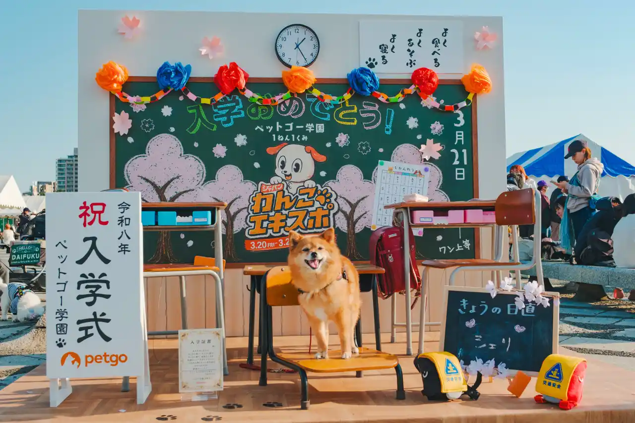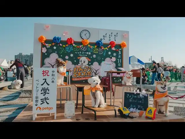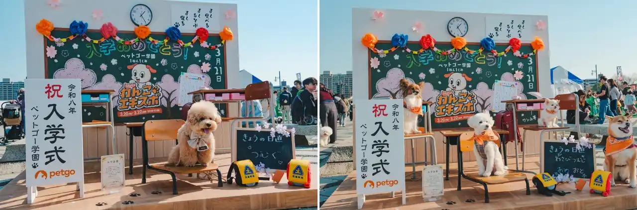 ペットゴー株式会社協賛のフォトスポットでは、教室風のセットの中で、多くのわんちゃんたちが入学式風の記念撮影を楽しみました。ランドセルを背負った愛らしい姿も多く見られ、飼い主の皆さまにもご好評をいただきました。また、ご自身の愛犬の名前を黒板に書ける演出も人気を集め、思い出に残る一枚を撮影できると喜ばれていました。さらに、フォトスポットで配布された入学証書も好評で、一緒に写真を撮影される姿が多く見られました。 |