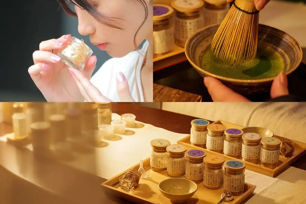 お好みの香原料を組み合わせ、自分だけの特別な塗香(ずこう)を作り上げる体験と抹茶点て体験。 |