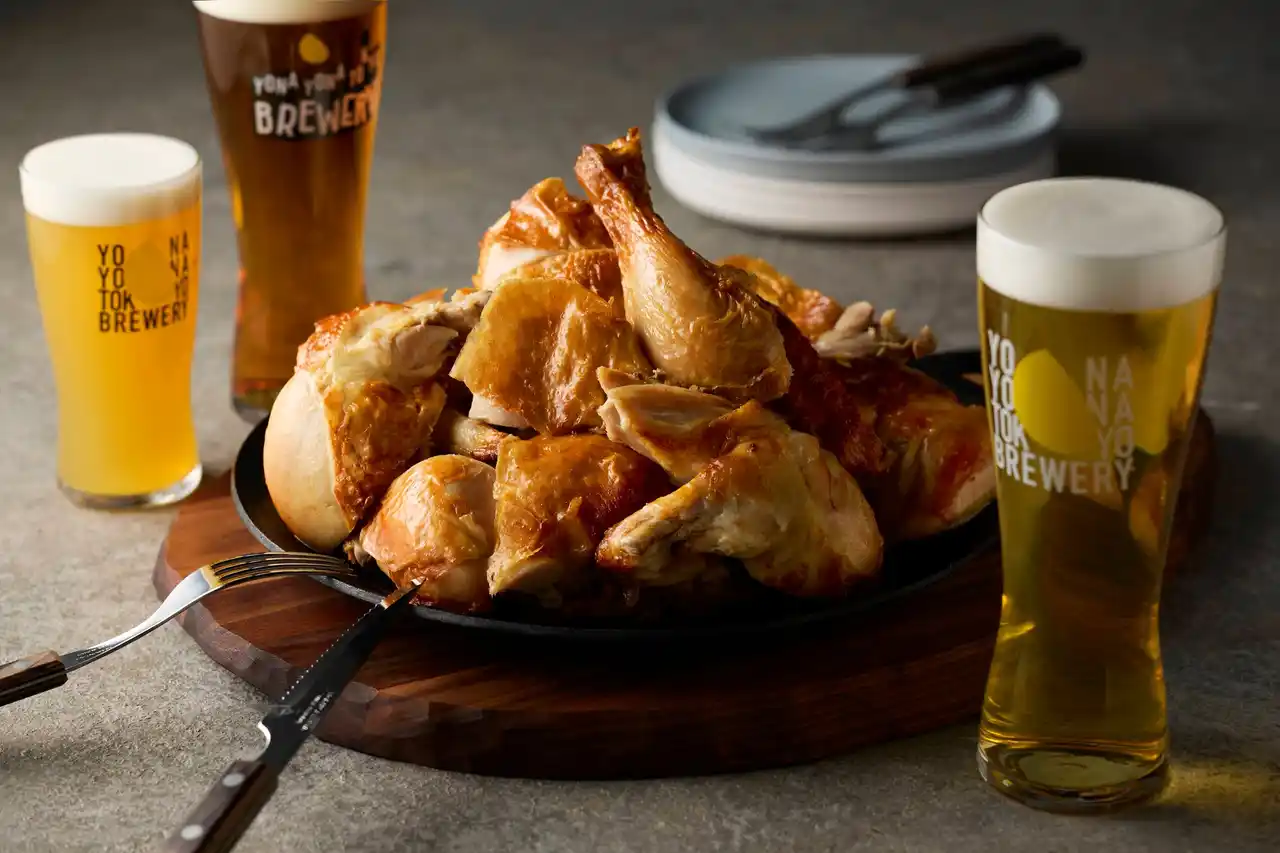 クラフトビールとの相性を考えて開発されたオリジナルフードを常時約30種類提供予定です。看板メニューは「国産菜彩鶏のローストチキン」と「自家製クラフトソーセージ」。ソーセージは、肉のミンチから腸詰めまですべて店内で行った完全オリジナルです。ローストチキンは「よなよなエール」、クラフトソーセージは「Gate One」との相性が抜群です。また、よなよな東京ブルワリー限定で、大人数で楽しめる大皿料理「宴ディッシュ」シリーズも展開。ローストチキンや生姜焼などを特大サイズで提供します。ランチタイムには「自家製ホットドッグ」などの限定メニューも登場予定です。仕事終わりの飲み会だけでなく、平日のランチとしても楽しんでいただけます。 |