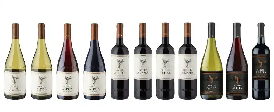 リニューアルするモンテス・アルファシリーズ。左から『モンテス・アルファシリーズ』ソーヴィニヨン・ブラン、シャルドネ、ピノ・ノワール、シラー、カルメネール、メルロ、マルベック、カベルネ・ソーヴィニヨン。『モンテス・アルファ・スペシャル・キュヴェシリーズ』シャルドネ、ピノ・ノワール、カベルネ・ソーヴィニヨン |