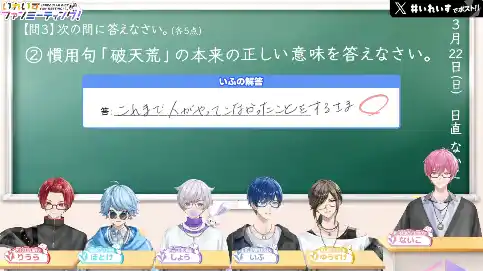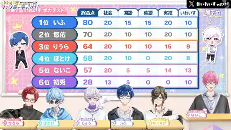 3月22日(日)、「いれいす」の公式YouTubeチャンネルにて勉強応援企画の生配信を実施しました。企画内では、1週間の間、StudyCastの「いれいすルーム」で「いれいす」メンバーが勉強した成果を競い合い、「進研ゼミ 中学講座」のオリジナル学力テストに挑戦する様子を生配信しました。当日は多くの方々が配信を同時視聴し、メンバーの回答結果を楽しみながら答え合わせをしました。 |