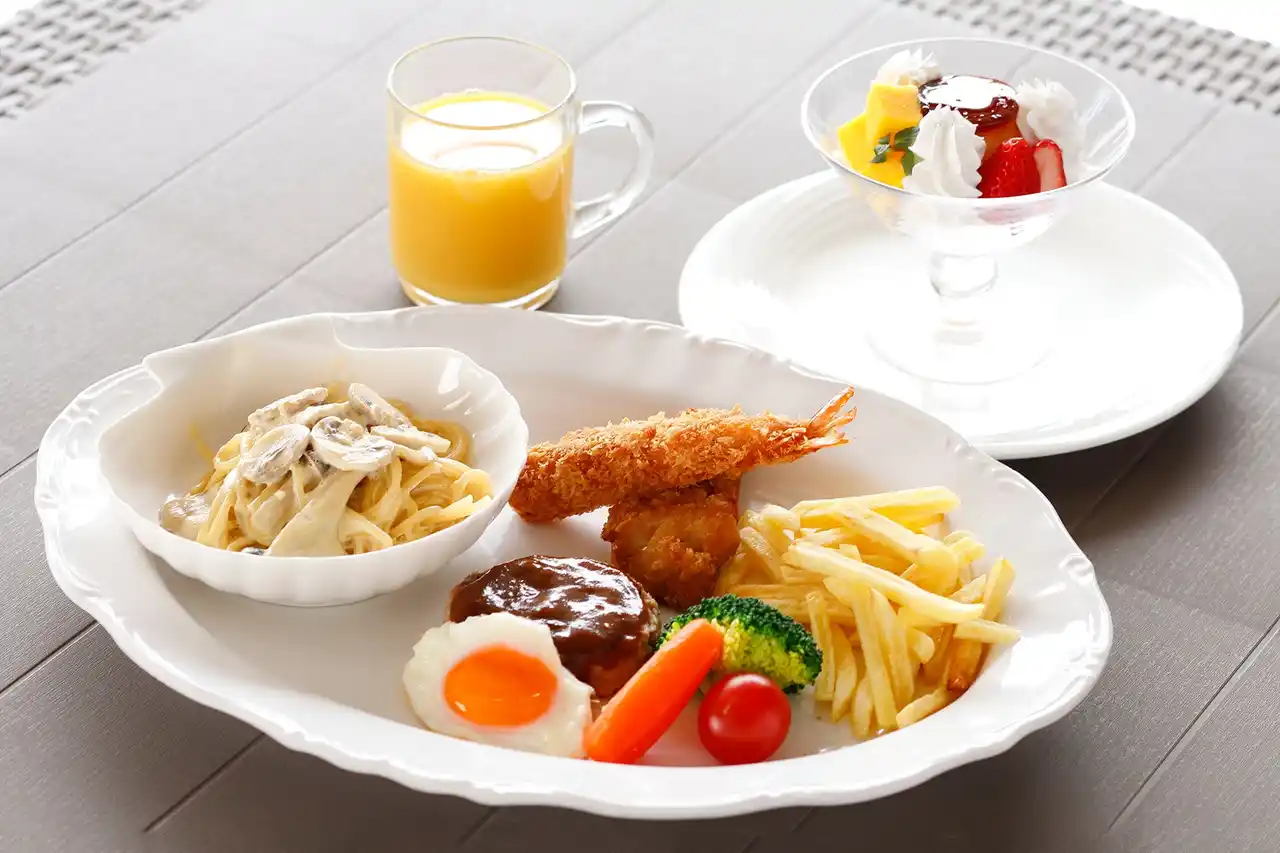 | お子さまから絶大な人気を誇る「ハンバーグステーキ」や「唐揚げ&エビフライ」に加え、ホテルシェフ特製の「キノコのクリームパスタ」など、ボリューム満点のキッズプレートをご用意しました。食後のデザートには、思わず笑顔がこぼれる「プリンアラモード」も。親子三世代でのご利用にも最適です。 | |||||||||
