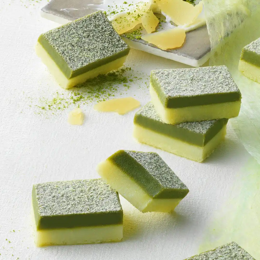 京都府産の宇治抹茶をブレンドしたホワイトチョコレートと、北海道産の3種のチーズ(マスカルポーネ、ゴーダ、クリームチーズ)を使用したホワイトチョコレートを2層に重ね、宇治抹茶を使用したチョコレートのパウダーをかけました。 |