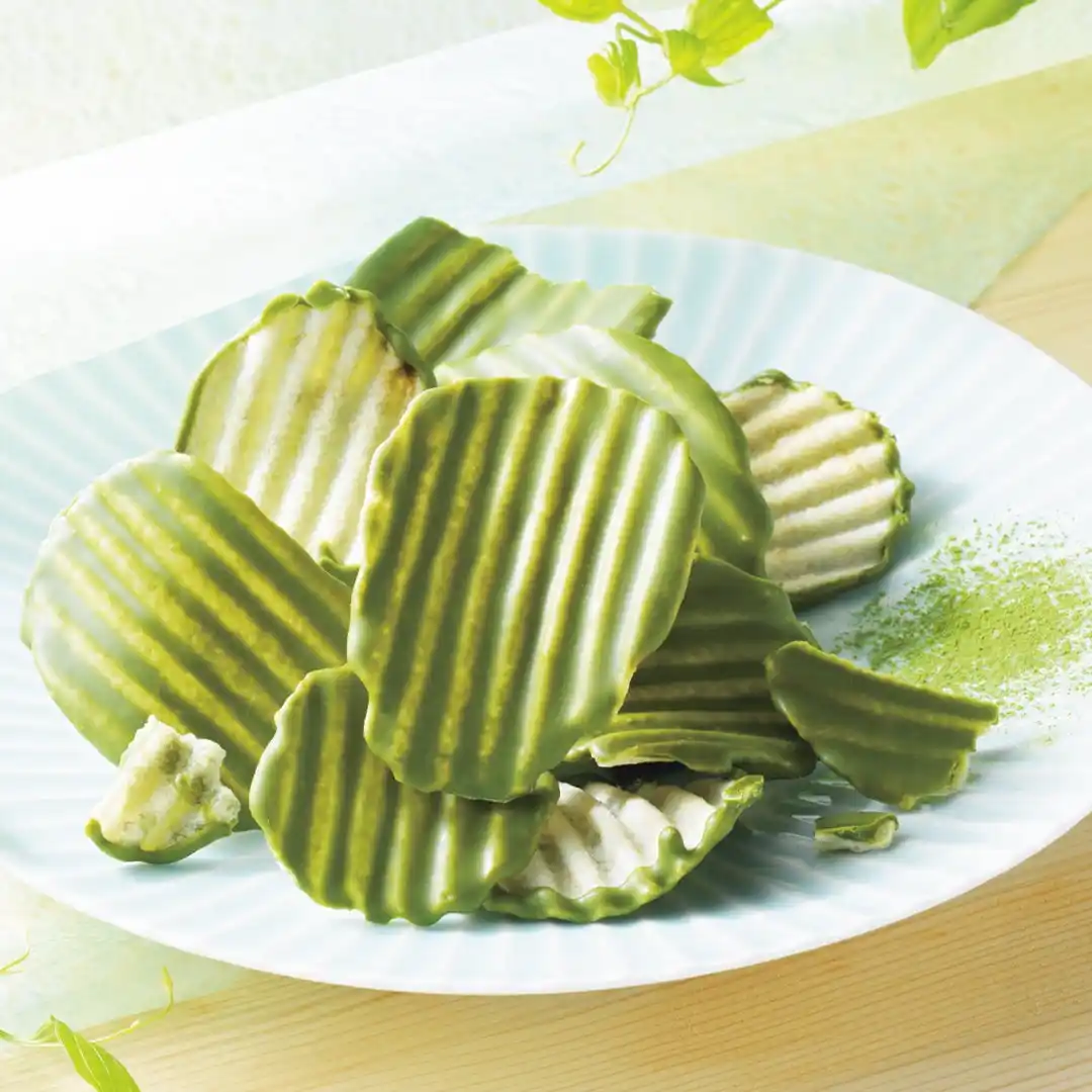 さわやかな苦みや渋みを持つ抹茶と濃厚な旨みや甘みを持つ抹茶の2種類をブレンドしたチョコレートを、「石垣の塩」を使ったポテトチップの片面にコーティング。チョコレートに隠し味のピスタチオペーストを加えることで、抹茶の風味にコクをプラスしています。 |