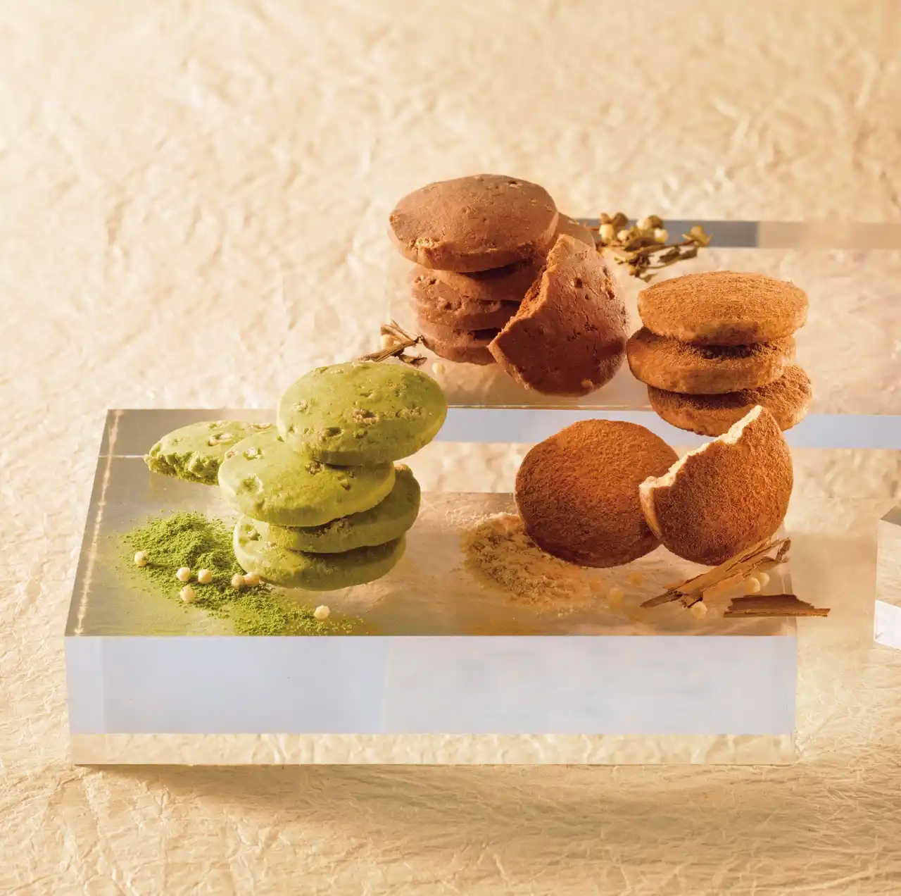 さくさくと歯ざわりのよいぶぶあられと、細かく砕いたローストアーモンドを生地に混ぜて焼き上げた、ほろっと口の中で溶けていくひと口サイズの焼きショコラ。[宇治抹茶]、[ほうじ茶]、[きなこ&シナモン]の3種類を詰め合わせました。 |