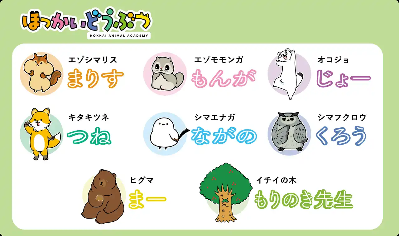 『ほっかいどうぶつ』とは、北海道の森にある小さな学び舎「ほっかいどうぶつ学園」を舞台に、個性豊かな動物たちがのんびり・にぎやかな毎日を過ごす物語です。 ときどき自然のことも教えてくれる、かわいくて愛らしい仲間たちの姿を、ショートアニメや4コマ漫画として各SNSで配信中! |