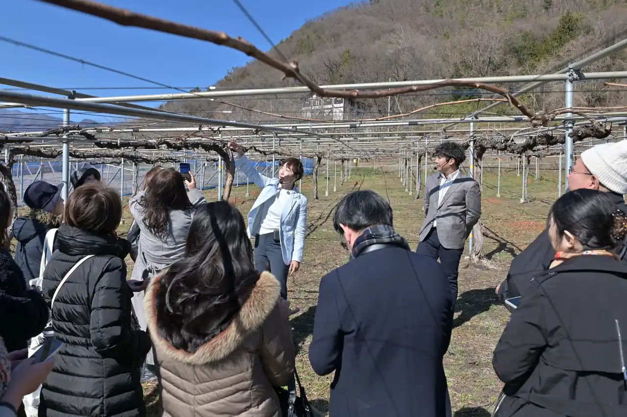 参加者は、山梨県甲州市塩山にあるKisvin Wineryの葡萄畑とワイナリーを訪れました。斎藤まゆ氏が、塩ノ山や富士山を望む開放的な景観が広がる葡萄畑と、通常は公開していないワイナリーを案内しました。ワイナリーでは、バトナージュ(*3)の前後で変化するワインの様子を見比べたほか、ワインボトルへのラベリング作業を見学するなど、Kisvin Wineryのワインが造られる過程を深く知る機会となりました。 |