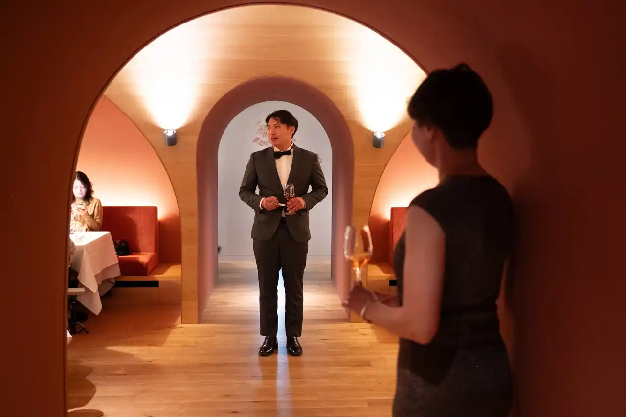 ディナーの中盤には、さらなるサプライズとして希少な「Kisvin Zinfandel Rose 2020」が振る舞われました。その席上で、Kisvin Wineryの醸造責任者が斎藤まゆ氏から川上黎氏へと引き継がれることが、本プログラムにて初めて発表されました。参加者は、川上黎氏が初めて醸造を行った特別なワインとともに、Kisvin Wineryの次代を担う川上氏の決意に耳を傾け、会場は温かな拍手に包まれました。 |
