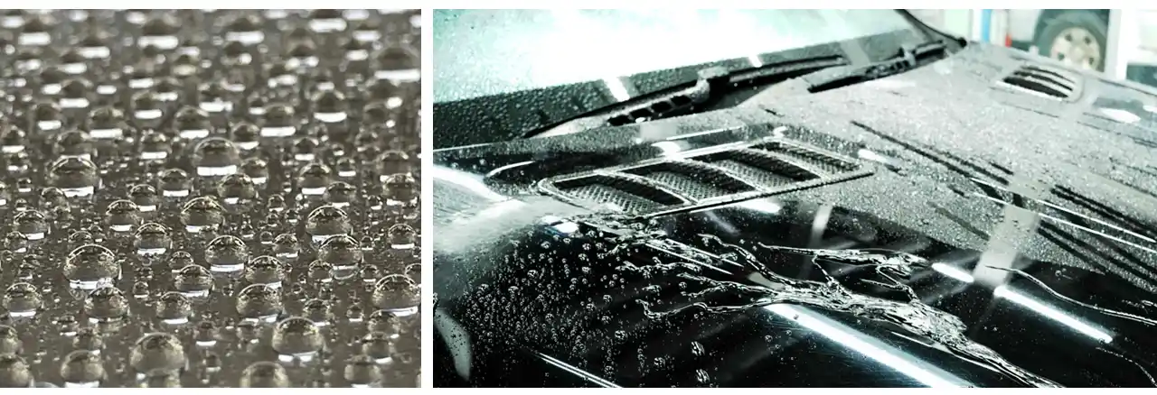 高い撥水性とスリック性により、水滴が丸く弾かれ、素早く転がり落ちます |