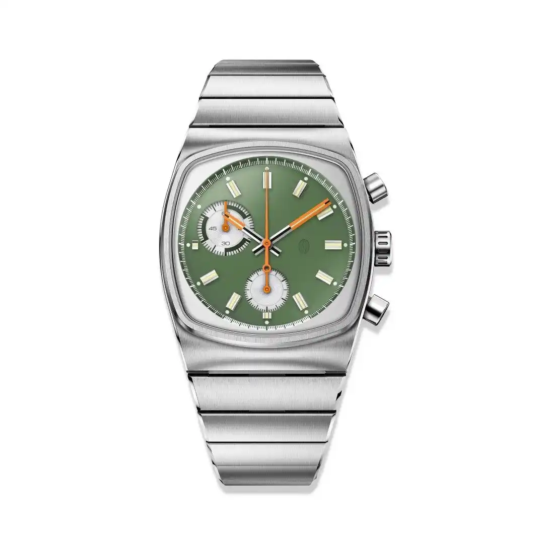 今作は日本の伝統的な【松葉色】や【柳色】を思わせる淡いグリーンをダイアルカラーに採用。針には【橙色】、インデックスには【蒸栗色】のようなマットなベージュカラーを施し、和のテイストを表現しています。ブランドコンセプトである“Brew time”(エスプレッソの適正抽出時間である25~35秒)はインナーリングのカラーを反転させた仕様に。 |