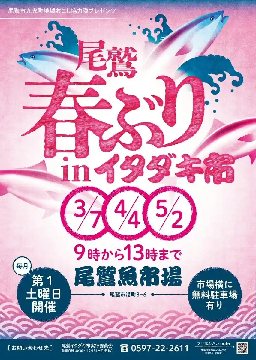 今回は4月4日(土)に開催される「尾鷲イタダキ市」をご紹介いたします。毎月第一土曜日に開催される本市は、新鮮な鮮魚、干物、野菜・果物、お惣菜など尾鷲でしか味わえないものが並びます。また、4月の開催では尾鷲春ぶりinイタダキ市として東紀州の春の味覚である「春ぶり」を使った商品の販売を行います。 |