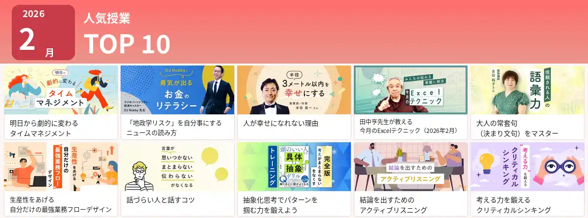 2月は、激動の時代に自律的に働くための基盤となる「思考力・時間管理・言語化力」をアップデートする授業10本が支持を集め、人気授業としてランクインしました。 |
