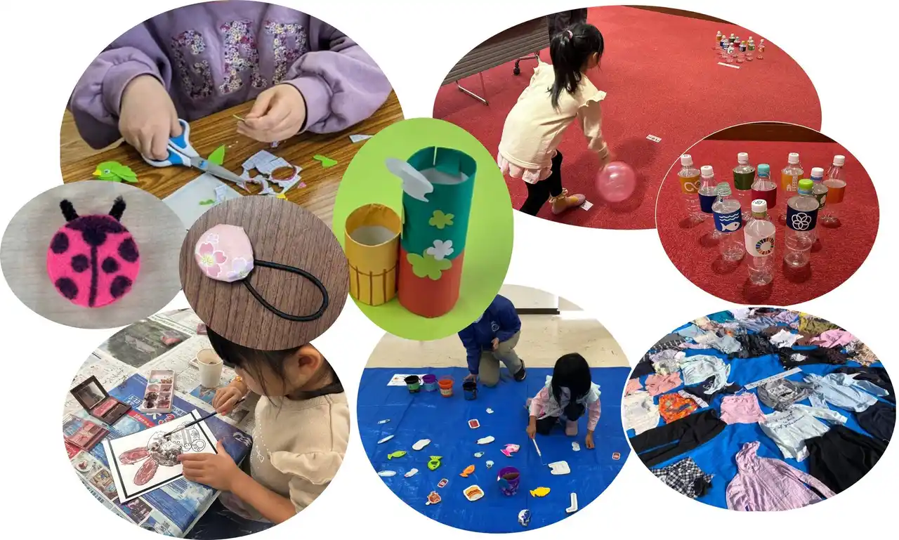 | ペットボトルキャップやトイレットペーパーの芯、化粧品、洋服など、身近なものを用いた工作やゲームでSDGsを学ぶ体験ができるイベントです。こどもたちのSDGsの理解促進やエコ意識を育むとともに、完成した作品は持ち帰り、日用品として使うこともできます。 | |||