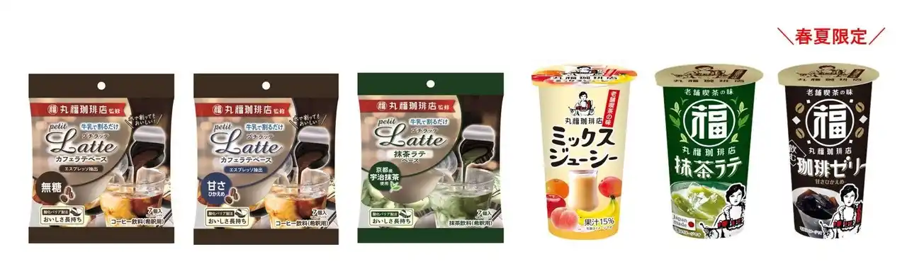 丸福珈琲店監修のシリーズ商品として、丸福珈琲店監修「プチラッテ カフェラテベース」「プチラッテ 抹茶ラテベース」「ミックスジューシー」などを販売中。また、春より季節限定の「珈琲ゼリー」も発売。様々な味わいをお楽しみください。 |