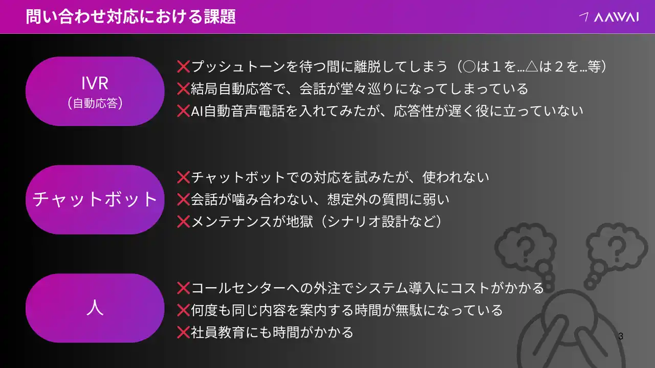 AAWAIはこの常識に対し、電話業務そのものをAIが担う「AIコール」という新しい解決策を提供します。 |