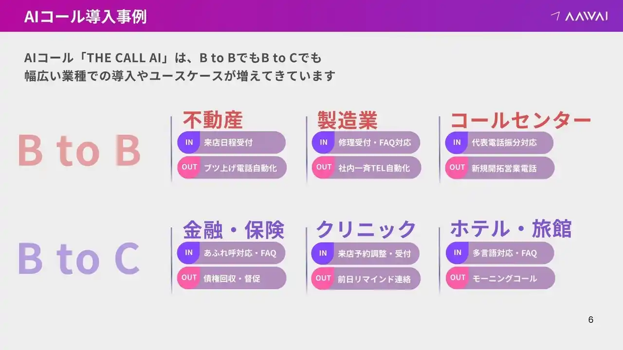 AAWAI株式会社(本社:東京都渋谷区、代表取締役:村澤 秀明)は、AIによるリアルタイム音声処理で電話の受発信を完全自動化するAIコール「THE CALL AI」の提供を開始しました。 |