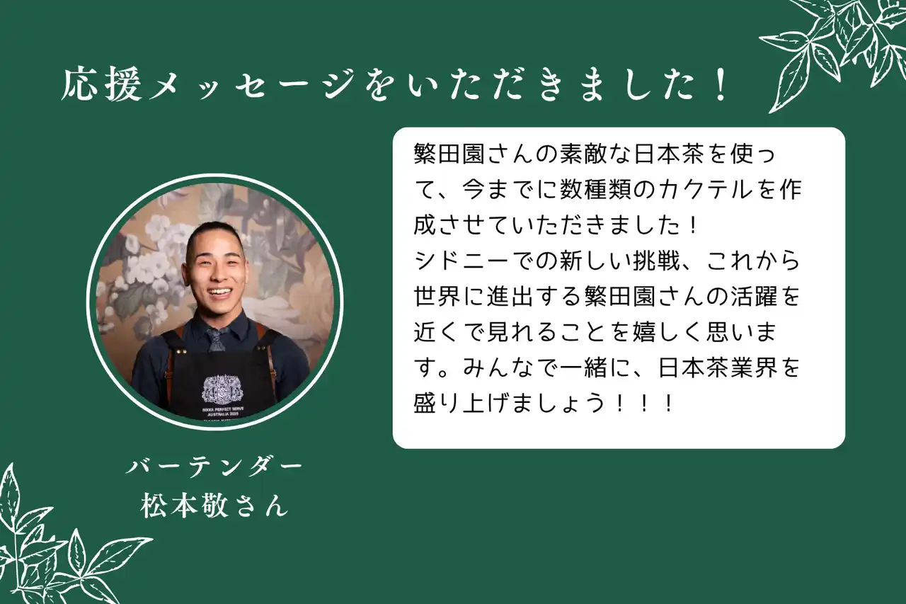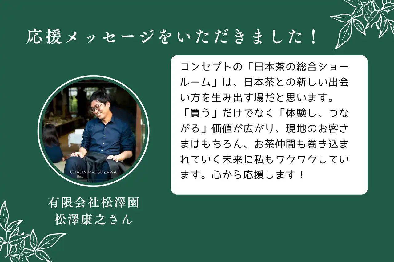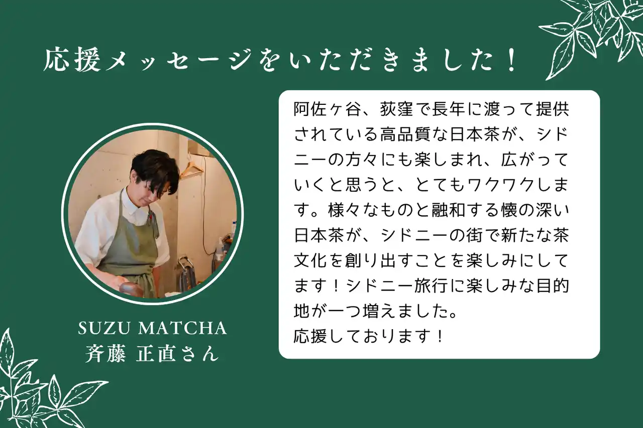 | また、今回オープンするお店は、シドニー初の日本茶専門店となることから、多種多様な日本茶とその文化をご紹介する総合的なショールームとなることを目指しており、日本茶業界の皆さまからも、続々と応援メッセージをいただいております。 | ||||||||||||