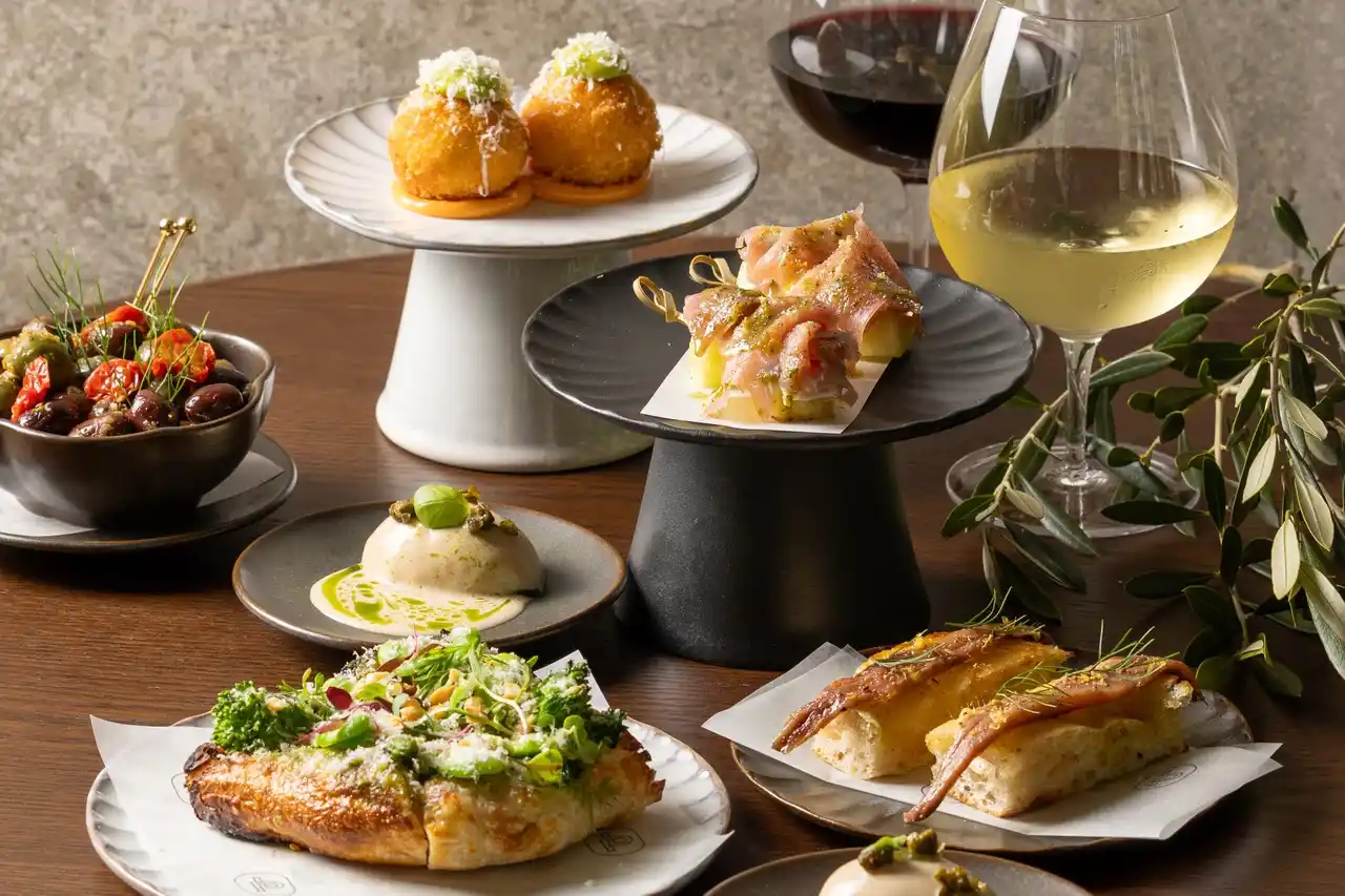 香り高いメロンを上品なキューブにカットし、薄くスライスした口どけの良いプロシュートを重ねることで、素材そのものの魅力と旨味を引き立てています。さらに、リグーリアの海辺のアペリティーボ文化を思わせるフォカッチャとアンチョビの一皿など、ハーブやオリーブオイル、海のニュアンスが繊細に調和する軽やかなカナッペが揃います。ドリンクはビールやワインをはじめ、バラエティ豊かなセレクションをフリーフローでご用意。カフェのテラスで、地中海のそよ風を思わせる開放的な空気とともに、初夏ならではの心地よいアペリティーボタイムをお楽しみください。 |