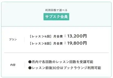予約専用サイトより、ご希望のレッスン日時をご予約いただく完全予約制です。予約時間の1時間前までお客様ご自身で予約専用サイトからキャンセルが可能で、急な用事などが入ってしまった場合も1回分を消化することなくキャンセル対応が可能で安心です。また、通いたいペースにあわせて、月4回、月8回のプランをお選びいただけます。月の利用回数を超えてご利用されたい場合は、1回あたり3,850円をお支払いいただければ追加での受講が可能です。 |