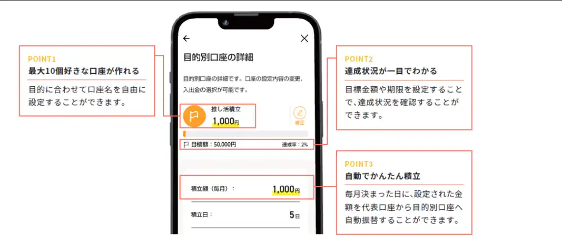 | お客さまの目的(旅行、教育、マイカー、推し活など)に合わせ、お金を分けて管理できるサービスです。最大10個の目的別口座が作成でき、口座にはお客さまご自身で「お好きな名前」をつけることが可能となります。 | |||