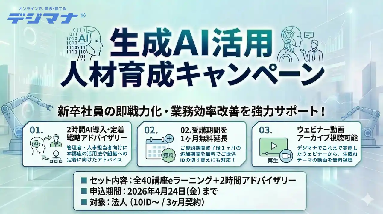 【株式会社新東通信】 新東通信、オンライン学習プラットフォーム「デジマナ」で『生成AI活用人材育成キャンペーン』を開始 ~新卒社員の即戦力化・業務効率改善を強力サポート~