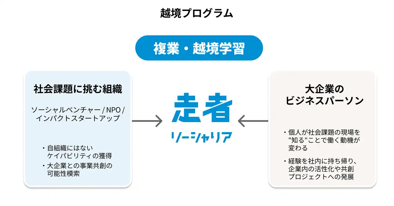 「越境プログラム」は、大企業のビジネスパーソンがソーシャルベンチャー・NPOやインパクトスタートアップといった社会課題に挑む組織の現場に、複業・越境学習という形で段階的に関わることを支援する構想です。 |