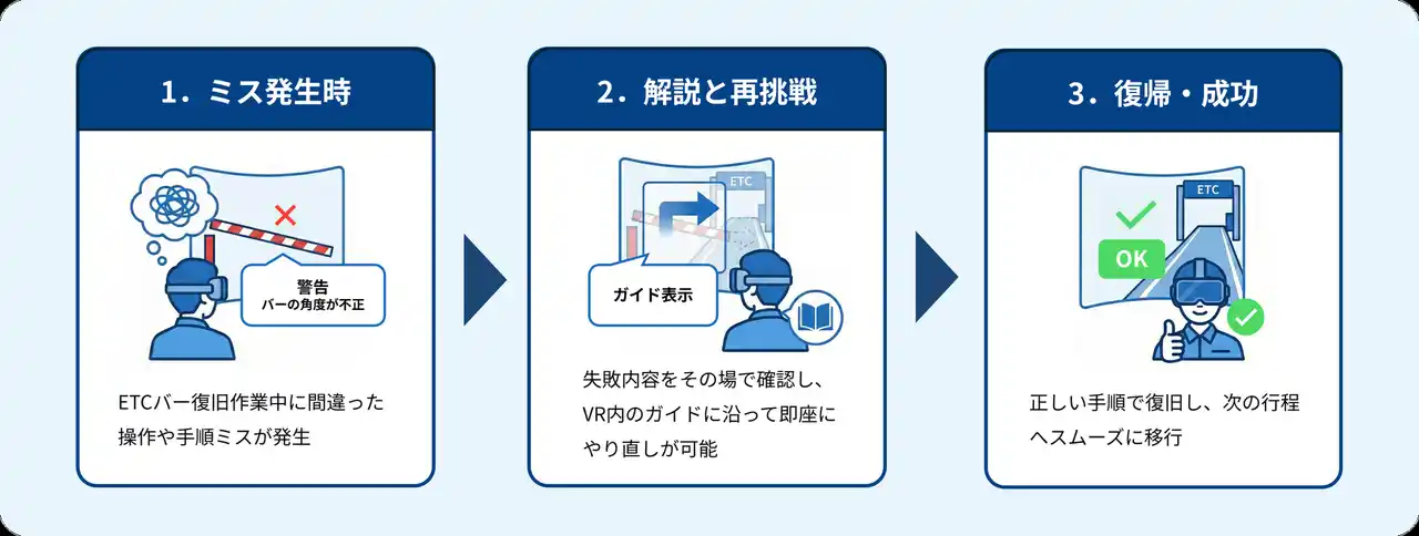 | さらに、作業手順を誤った際に、その場ですぐに振り返ってやり直しできる「失敗時の即時リトライ機能」を備えました。失敗の要因を即座に確認し、ガイドに従ってその場でやり直すことで、正しい手順を効率よく習得できます。 | |||