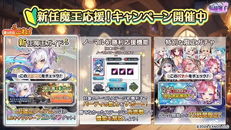 「難しくて進めない…」という新任魔王様もご安心ください!対象のノーマルステージ初勝利まで、パーティの能力をしっかりサポートいたします。 |