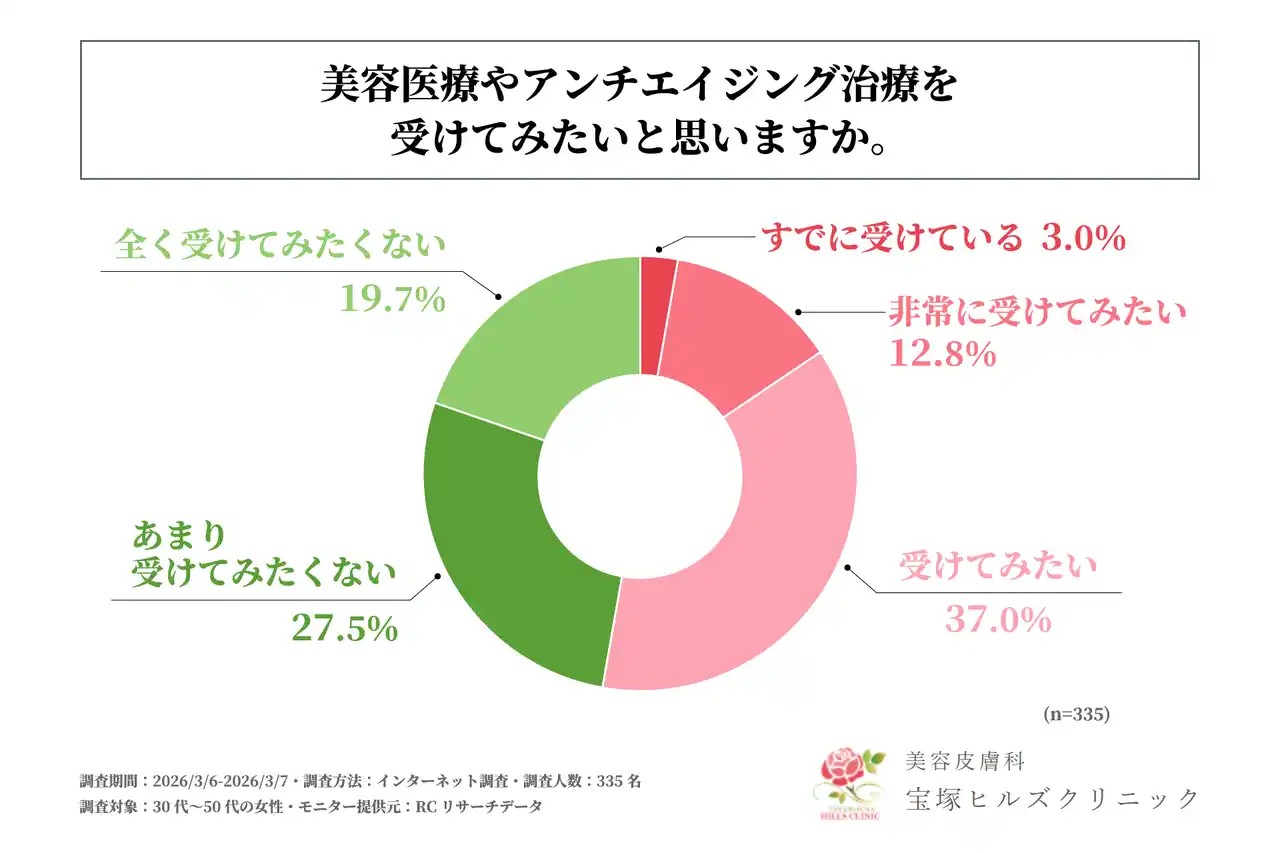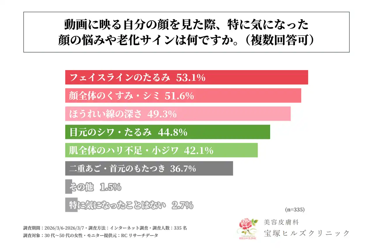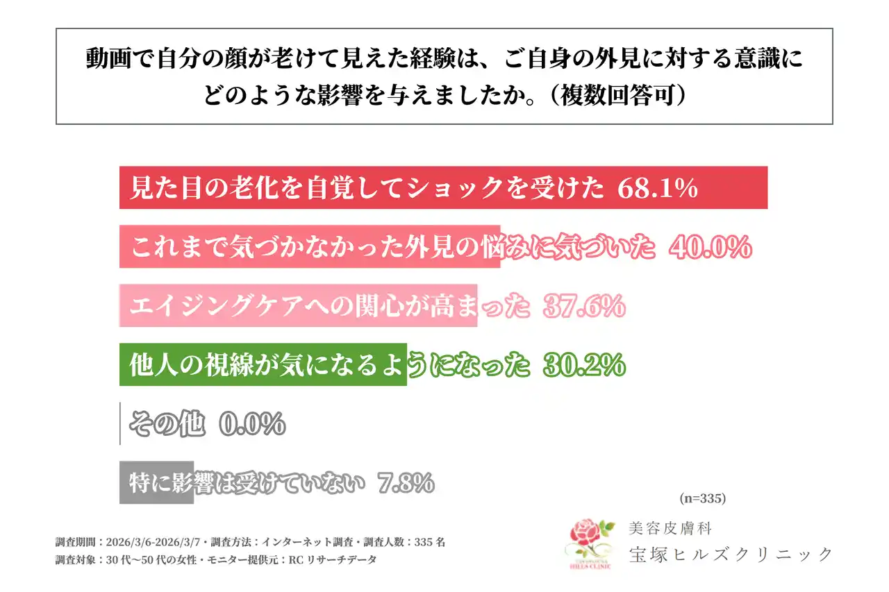 美容皮膚科の宝塚ヒルズクリニック(所在地:兵庫県宝塚市、院長:高橋 裕二)は、30代~50代の女性を対象に「動画での老け見えが美容意識に与える影響に関する調査」を実施しました。この調査から、30代~50代の女性が動画に映る自身の顔から受ける印象や、それがきっかけとなる美容意識の変化、美容医療への意欲などが明らかになりました。