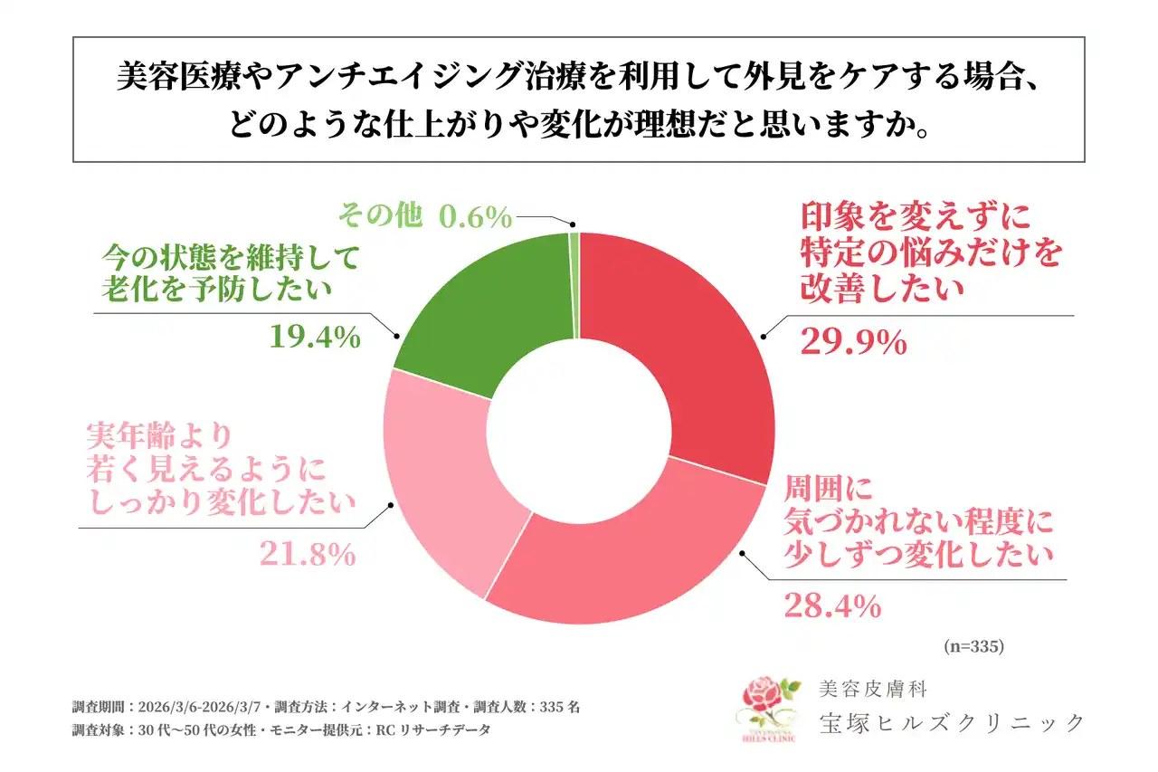 美容医療やアンチエイジング治療を利用して外見をケアする場合、理想とする主な仕上がりや変化は、「印象を変えずに特定の悩みだけを改善すること」や「周囲に気づかれない程度に少しずつ変化すること」 |