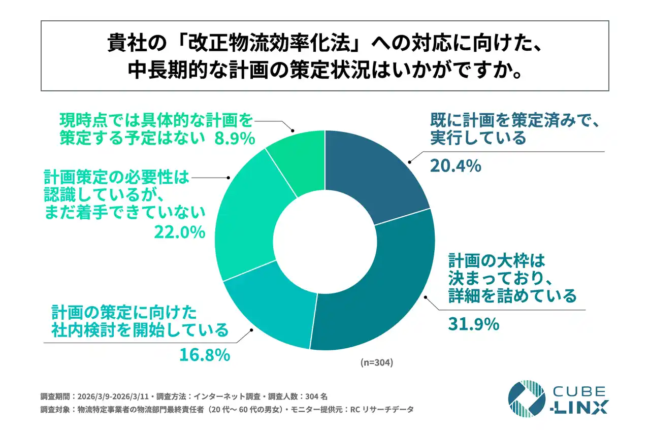 電動車及び付帯設備の導入支援事業を展開する株式会社CUBE-LINX(本社:東京都日野市、代表取締役:桐明 幹)は、物流特定事業者の物流部門最終責任者(20代~60代の男女)を対象に「改正物流効率化法への対応実態に関する調査」を実施しました。この調査から、物流特定事業者の物流部門最終責任者が感じている改正物流効率化法の義務化への負担や、同法の対応に向けた具体的な取り組みや課題などが明らかになりました。