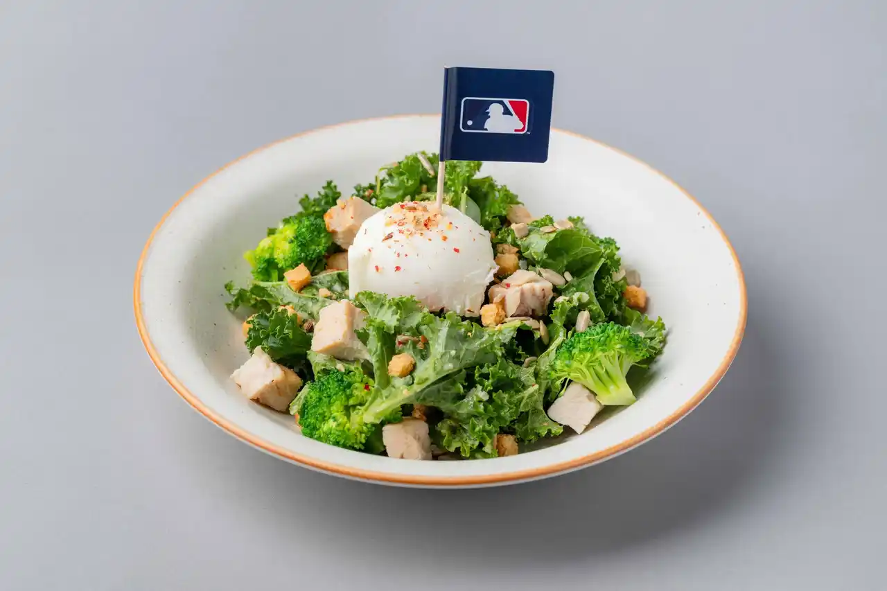 ボールパークの天然芝をイメージしたケールに、グリルチキンを合わせたサラダ。ボールに見立てたポーチドエッグを絡めて楽しむ、朝食にぴったりの一品です。MLBのベンチでもおなじみのひまわりの種を加え、食感のアクセントもプラスしました。 |