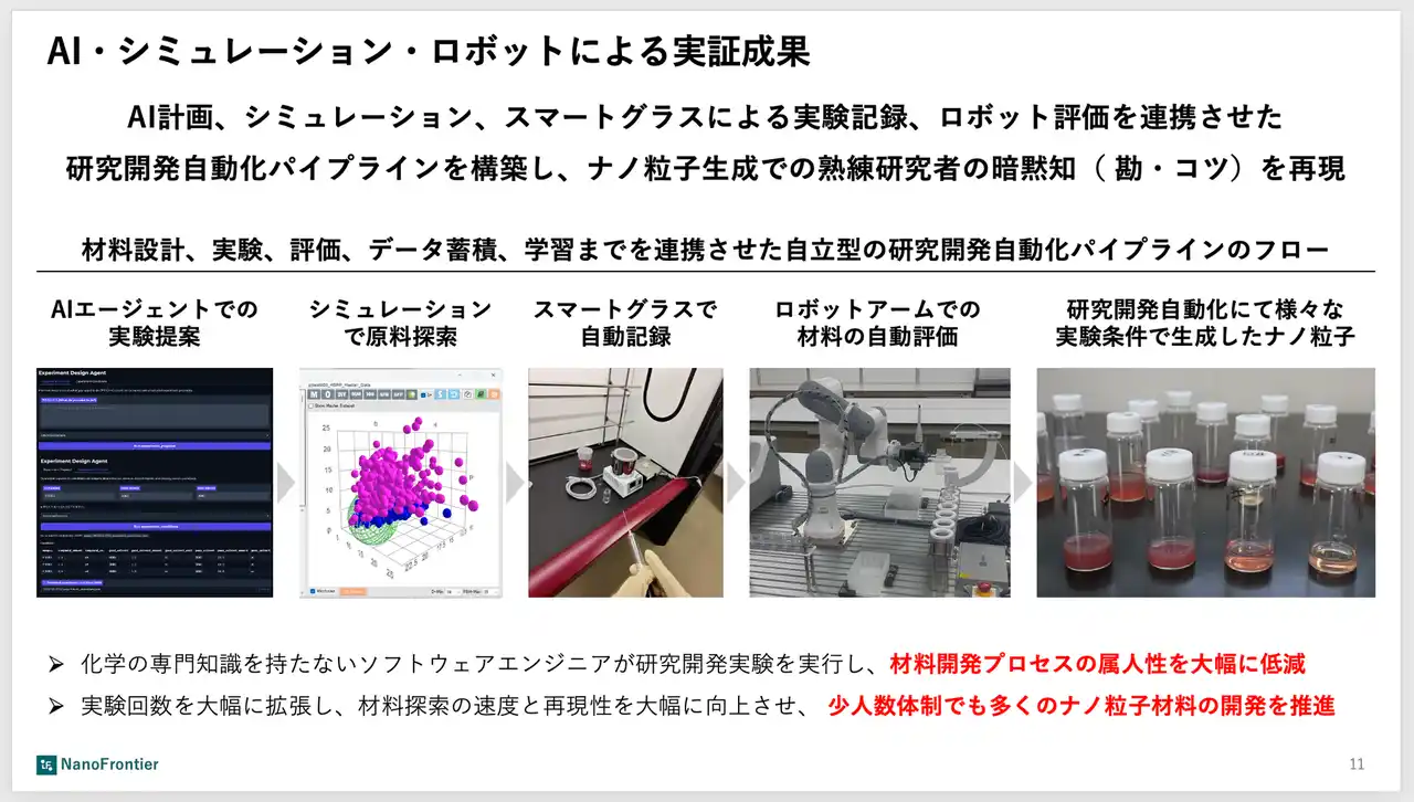 当社は、AIエージェントによる実験提案・シミュレーションによる原料探索・スマートグラスでの自動記録・ロボットアームによる材料評価を一連のパイプラインとして連携させ、ナノ粒子生成における熟練研究者の暗黙知(勘・コツ)をAIで再現する研究開発自動化システムを構築しました。さらにテーマ探索から補助金探索・特許作成・潜在顧客探索まで、研究開発に付随するすべての業務をAIが担う統合パイプラインへと発展させています。 |