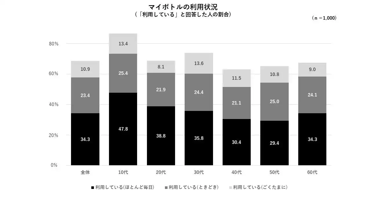 ・今回新たにマイボトル利用状況を調査したところ、約3割(34.3%)以上が「利用している(ほとんど毎日)」と回答し、「利用している(ごくたまに)」まで含めると、約7割(68.6%)の利用状況でした。また、年代別では10代(86.6%)が最も高いことが分かりました。さらに、マイボトルに入れる飲み物は「ミネラルウォーター」(50.0%)が最多でした。ミネラルウォーターを好きな容量や冷たいままの状態で持ち歩きたいといったニーズがあるものと考えられます。 |