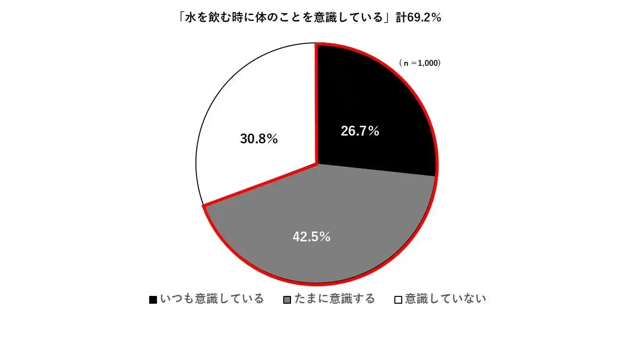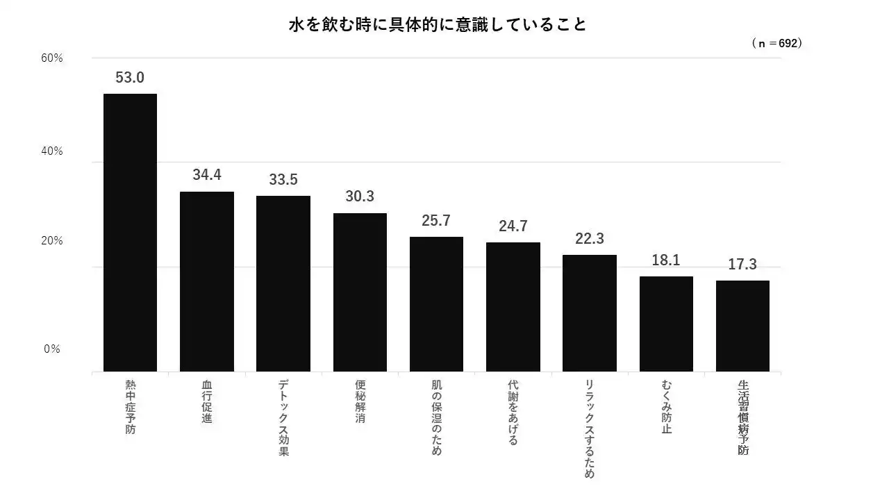 ・「水を飲む時に体のことを意識している」人は約7割(69.2%)でした。具体的な理由として、「熱中症予防」が最も多く挙げられた一方、「デトックス効果」「肌の保湿」なども理由として挙げられ、特に女性は健康や美容への意識と結び付く傾向が見られました。 |
