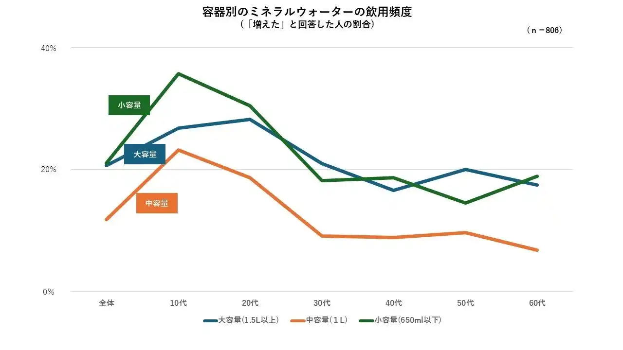 ・ミネラルウォーターの飲用(利用)頻度は、「ほとんど毎日」が最も多く、36.5%でした。容器別の飲用(利用)頻度では、全容量において、10代~20代の飲用頻度が増加傾向にあり、特に中容量・小容量においてはその傾向が顕著に見られました。若年層を中心にパーソナルサイズの需要が拡大しているものと見られます。 |