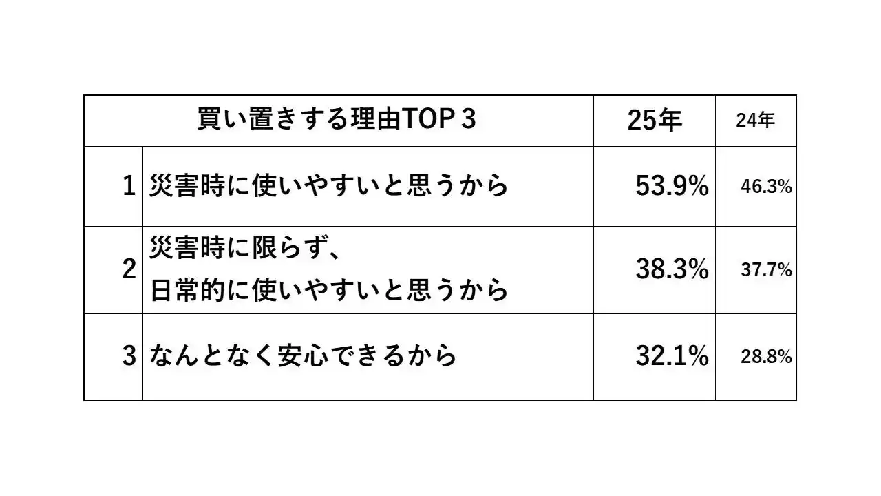・「ミネラルウォーターの買い置きがある」人は64.2%となり、理由として、「災害時に使いやすいと思うから」(53.9%)、「災害時に限らず、日常的に使いやすいと思うから」(38.3%)、「なんとなく安心できるから」(32.1%)の3項目が上位に挙がりました。さらに、昨年に比べ、「災害時に使いやすい」「何となく安心できる」という理由が大きく上昇。防災意識の高まりから水の備蓄が一般的となり、水分補給に限らない水の用途が広がっていると考えられます。 |