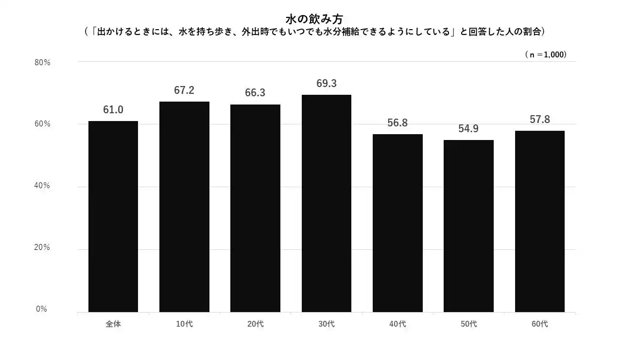 また、「出かけるときには、水を持ち歩き、外出時でもいつでも水分補給できるようにしている」人の割合は、全世代の中でも特に10代~30代のスコアが高く、若年層は飲用水の持ち歩きニーズが高いことが分かりました。 |