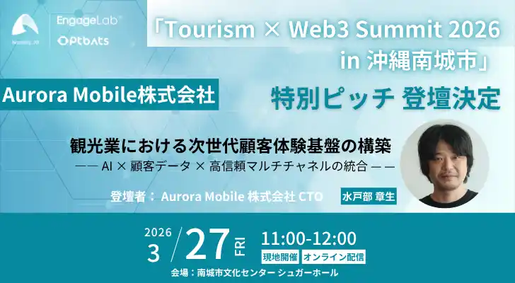 顧客エンゲージメントおよびマーケティングテクノロジーのグローバルプロバイダーである米国ナスダック上場 Aurora Mobile Limited(以下 Aurora Mobile)の日本法人、Aurora Mobile株式会社は、一般社団法人日本Web3ツーリズム協会が主催する「Tourism × Web3 Summit 2026」に、協賛企業として参加することをお知らせいたします。 |