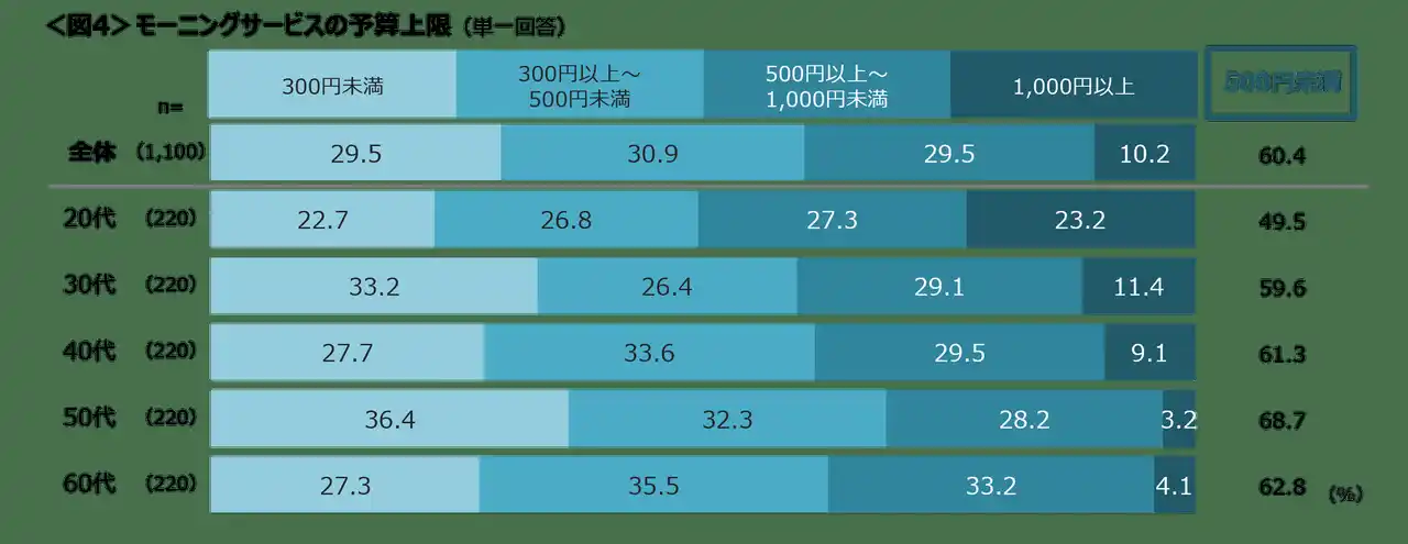 年代が上がるほど、「500円未満」の割合も高くなる。20代は「1,000円以上」が23.2%と、モーニングサービスにお金をかける人も一定数存在する。<図4> |