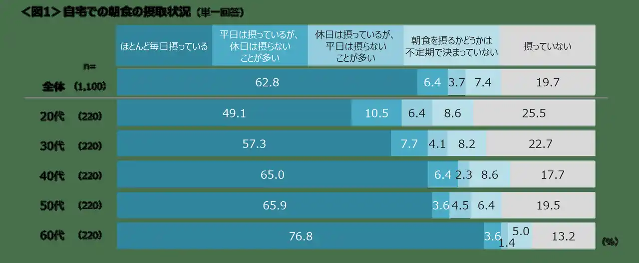 年代が上がるにつれて毎日朝食を摂る割合が高く、60代では76.8%に対し、20代は49.1%にとどまる。<図1> |