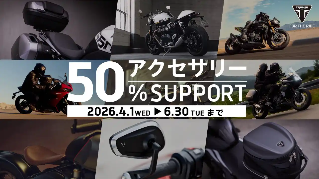 | トライアンフモーターサイクルズジャパン株式会社(本社:東京都港区海岸 代表取締役社長:大貫陽介)は4月1日(水)~6月30日(火)までの期間中、全国のトライアンフ正規販売店にて「アクセサリーご購入50%サポートキャンペーン」を開催することをお伝えします。 | |||