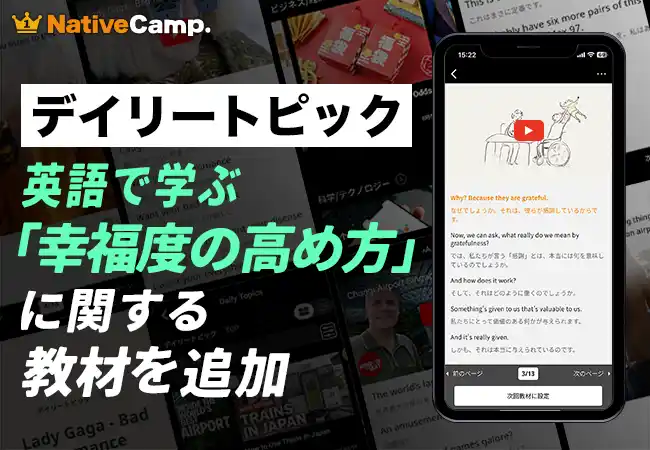 レッスン回数無制限のオンライン英会話サービス「ネイティブキャンプ英会話」を展開する株式会社ネイティブキャンプ(東京都渋谷区 代表取締役:谷川国洋)は、人気教材「デイリートピック」において、現代社会で関心の高まっている「ウェルビーイング(Well-being)」をテーマにした新教材を公開いたしました。 |